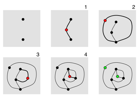 Sprouts is a simple and delightfully subtle pencil-and-paper game for two players. The game is set up by marking a number of spots on a page. Each player makes a move by drawing a curve that joins two spots, or that loops from a spot back to itself, without crossing any lines drawn earlier, and then marking a new spot on the curve.