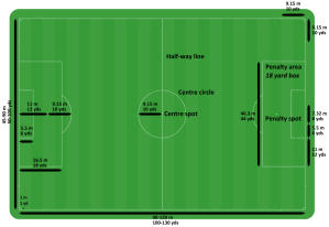 What about the penalty area? The ratio here is 2.444; we’re getting cold. What about the goal area? The ratio is now 3.331, colder still. And the most prominent rectangle, the goal itself, is eight yards wide and eight feet high, with a ratio of 3 to 1, nowhere remotely near φ.