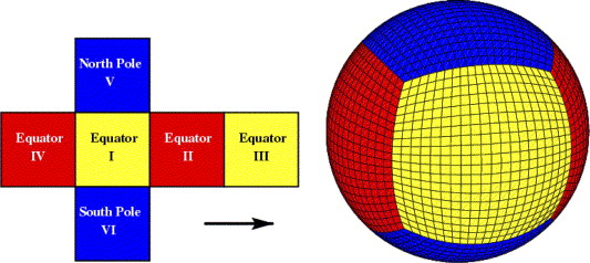 The cubed-sphere grid, which maps points on a sphere onto the six faces of a cube, gives a conformal grid, with quasi-uniform resolution. Instead of the two poles of a regular lat-long grid, there are now eight poles. However, they are much easier to handle than those of the lat-long grid.