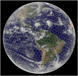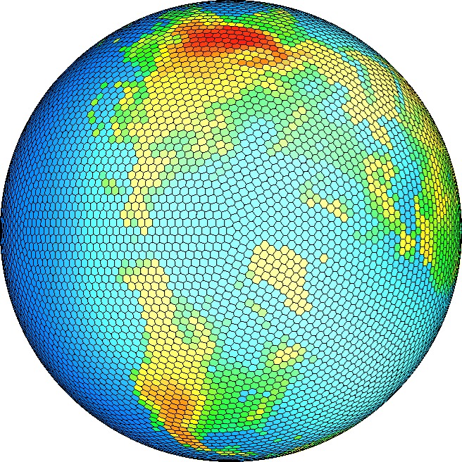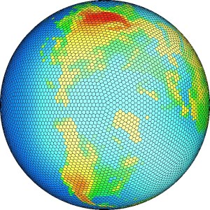 Above is an adaptive grid, with variable resolution. Called a Spherical Centroidal Voronoi Tessellation, it is used in the MPAS (Model for Prediction Across Scales) that allows variable resolution on the sphere, on limited areas of the sphere. Note the smaller cells over North America, giving enhanced resolution there.