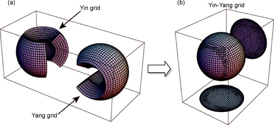 The Yin–Yang grid is composed of two identical grids with the same shape and size, one a part of the normal latitude–longitude grid, the other identical but rotated. The Yin and Yang grids combine to cover the entire globe, overlapping each other at their borders. The Yin–Yang grid has been applied to simulations of various fields, including global circulation models of the atmosphere and ocean.