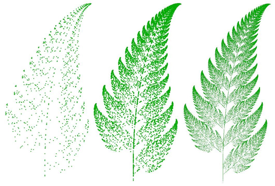 Probably the most famous is the so-called Barnsley Fern. The algorithm or procedure is very similar to that described for the Sierpinski Gasket, but now four different linear maps are used in the IFS instead of one, and the choices between them are made on the basis of random numbers, with prescribed probability for each map (see Wikipedia article [4] for full details). The algorithm can be coded in a few lines of MatLab or Mathematica. We show the results at several stages below: