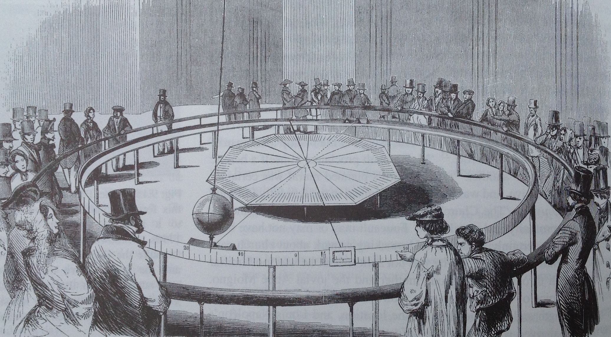 The announcement of the experiment read “You are invited to see the Earth spinning … ”. A bob of mass 28 kg was suspended from the dome of the Panthéon by a 67 metre wire. The pendulum swung through a diameter of about six metres, and the position was indicated on a large circular scale. Demonstrations were held daily, and attracted large crowds.