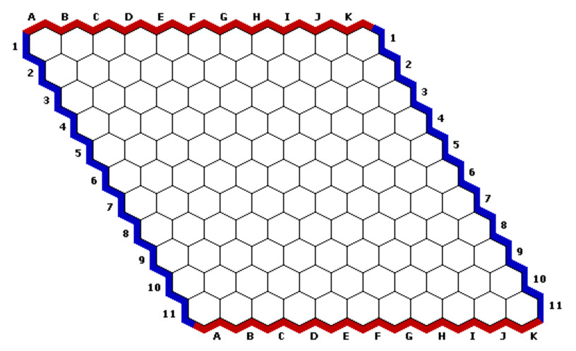 Hex is an amusing game for two players, using a board or sheet of paper divided into hexagonal cells like a honeycomb. The playing board is rhomboidal in shape with an equal number of hexagons along each edge. Players take turns placing a counter or stone on a single cell of the board. One uses white stones, the other black. Or red and blue markers can be used on a paper board.