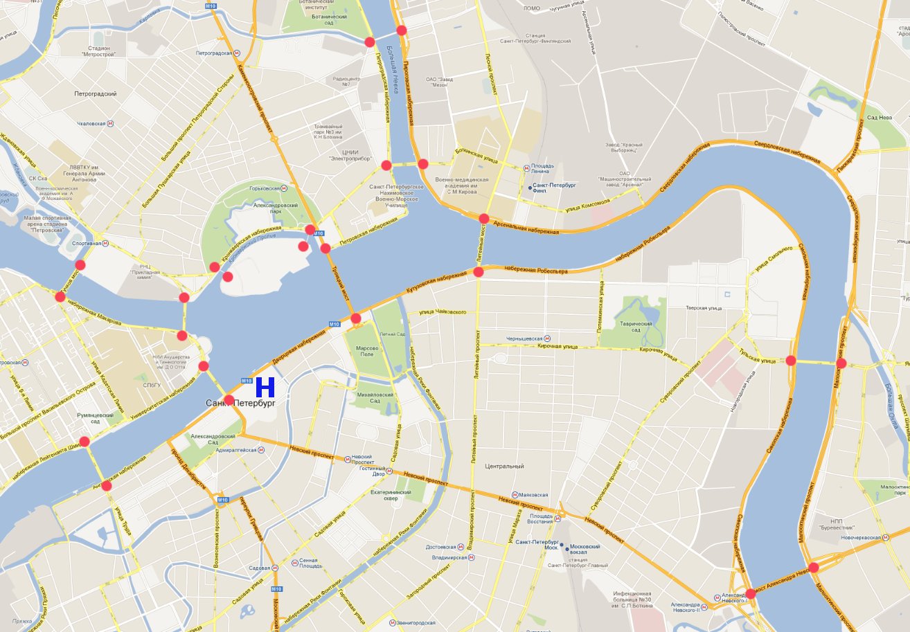 Q1: On the map of central St. Petersburg, shown below, twelve bridges are marked by pairs of red dots.