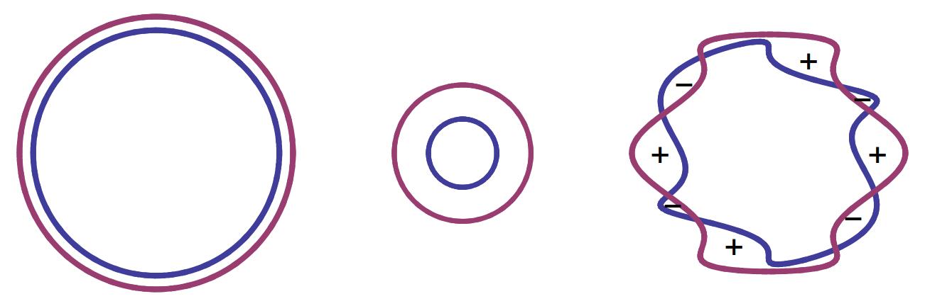 Do the tracks have to be circular for the area between them to remain fixed? Suppose both wheels trace out simple closed curves with winding number 1 (rotating through one anticlockwise turn). An example is shown in Fig. 3, right panel. In general, when the tracks cross, we must count as positive areas where the back wheel is within the front track, and as negative those where it is outside.