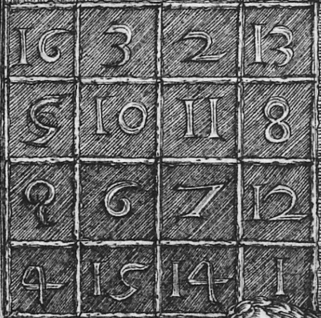 Behind the main figure is a four-by-four grid with the first sixteen counting numbers. Each row and each column sums to 34, as do the diagonals. This is the first occurrence in western art of a magic square. It has many other interesting mathematical symmetries. A curious aspect of the square is the appearance of the numbers 15 and 14 in the centre cells of the bottom row, corresponding to 1514, the year the engraving was made.