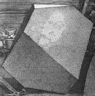 The large polyhedron at centre left has four visible faces, three pentagons and an equilateral triangle. Assuming that the hidden side of the polyhedron is of similar form, we have six pentagons and two triangles. It is a truncated rhombohedron, like a stretched cube with two corners clipped off, but just what inspired Dürer to draw it is a mystery. On the front of the polyhedron, the ghostly image of a face can be seen.