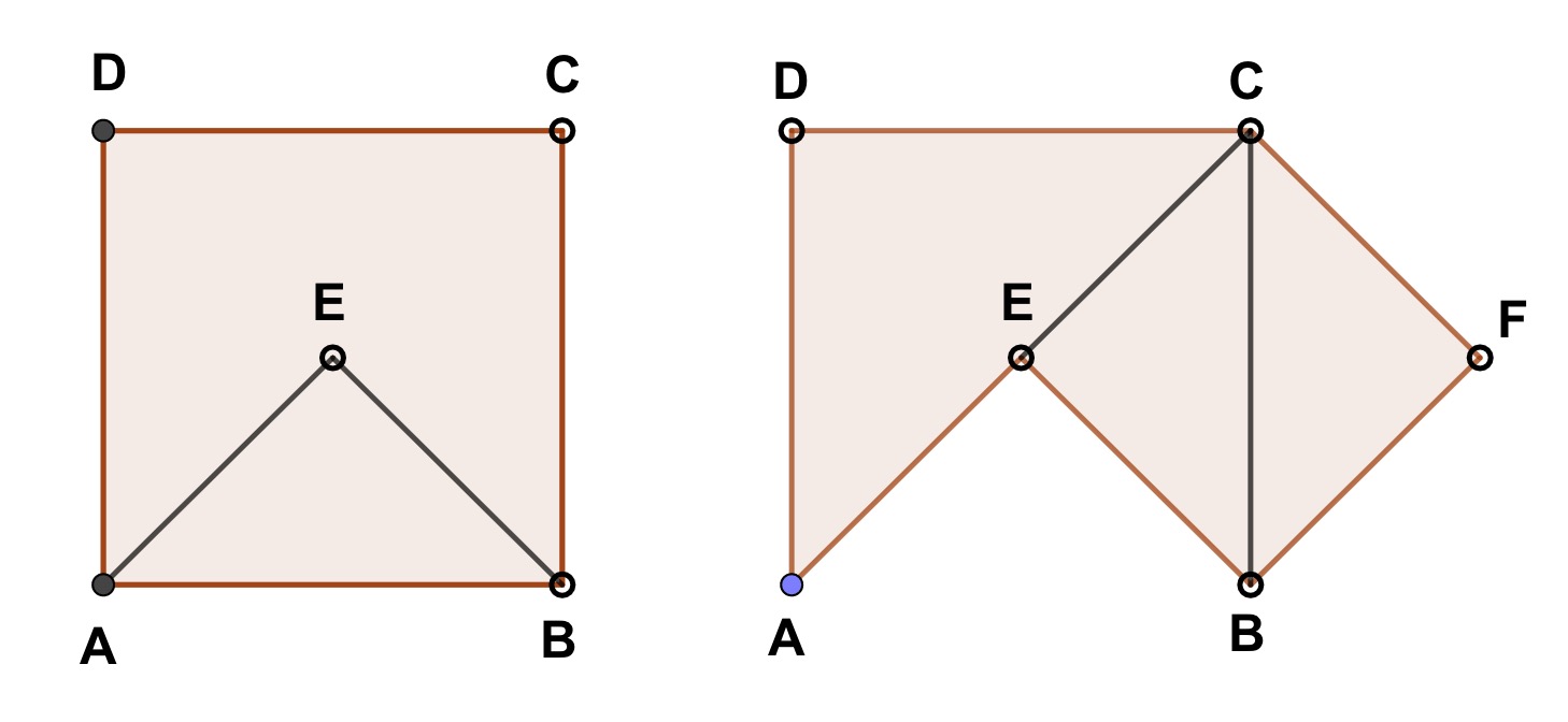 Thane started with a simply stated geometric puzzle. A triangle (ABE) is cut from a square (ABCD) and placed at one side to form a smaller square. Find a way of restoring the square by a single action different from the exact reversal of this transformation. (Thane got this problem from David Klarner over 25 years ago who, in turn, got it from N G de Bruijn. The ultimate source is unknown.).