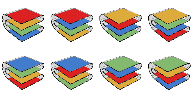 Moving up one dimension, we may now have both vertical and horizontal creases. There are eight ways to fold a 2 × 2 map along its creases, counting each different vertical sequence of folded panels as a distinct way of folding the map.