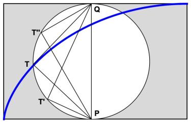 For rolling motion, the instantaneous centre of rotation of the disk is the point of contact P (figure above) and the vertical line PQ is the diameter of the disk. All points T, T’, T” on the boundary of the disk move in directions orthogonal to the chords joining them to P. In particular, the angle PTQ is a right angle so TQ is a segment of the tangent to the cycloid. As the disk rolls, the point Q moves and the chords tangent to the cycloid sweep out the region above this curve.