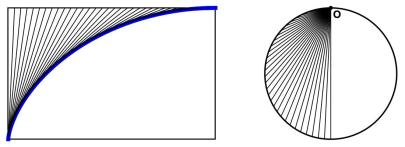 We draw a set of tangents for the left-hand side of the arch in the figure below (left panel). Now moving all these segments horizontally and parallel to themselves so that they have a common upper point O (figure below, right panel), we see that they fill a semi-circle of radius . The tangents for the right-hand side of the arch complete the circle. Thus, the area of the tangent cluster is