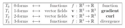 , it reduces to the classical vector operators grad, curl and div (see table). The familiar identities