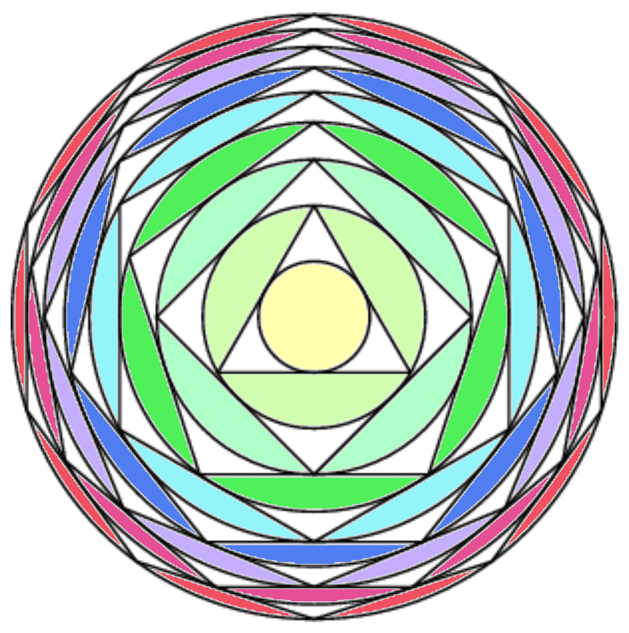 Let us start with the unit circle, and draw a nested sequence of regular polygons, of increasing order and size, each with its circumcircle (see Figure). Thus, we have a trigon (triangle), a tetragon (square), a pentagon, a hexagon, and so on to the N-gon. The outermost circle, surrounding the N-gon, has radius