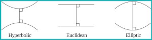The distinction can be illustrated by considering two straight lines in a two-dimensional plane that are both perpendicular to a third line (see Figure above). In Euclid’s geometry, the two lines remain equidistant from each other (they are parallel). In hyperbolic geometry, they veer away from each other, while in elliptic geometry, they curve toward each other and intersect.