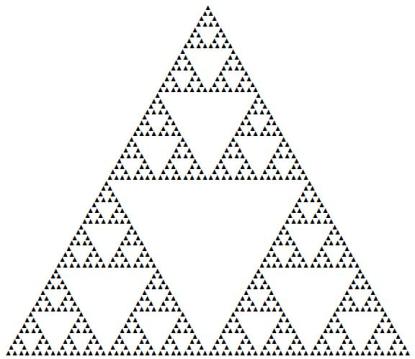 There is yet another way to generate the Sierpinski triangle. The even entries in Pascal’s Triangle are arranged in triangular groups, like the white portions of the figure above. If all even numbers are eliminated, what remains in the limit has the structure of the Sierpinski triangle. The figure below is obtained by plotting a small triangle at each of the odd entries for the first 64 rows of Pascal’s Triangle. It also illustrates the structure of the Hanoi graph , which has