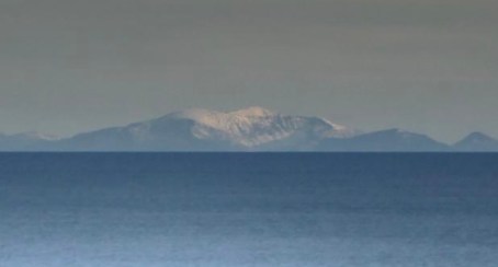 Using the above formula, the horizon from the top of Snowdon, at 1085 m, is 118 km. The horizon from the Ben of Howth (171 m) is at 47 km. The sum of these distances (165 km) exceeds the great circle distance of 140 km between the two peaks. Therefore, each is above the geometric horizon of the other. However, the photograph shows several lesser peaks in Wales, and extensive lower ground. How can this be?