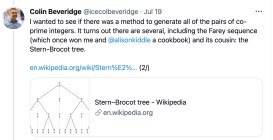 This investigation led Colin to ask if there is a method to generate all of the pairs of co-prime integers. He found that there are several, including the Farey sequence and the Stern-Brocot tree. Both have been described on thatsmaths,com, at Farey sequence and Stern-Brocot sequence. He found a range of interesting results and noted that “there’s loads more to play with here”. If you would like to explore this topic, see the twitter thread here.