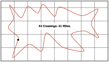 Imagine a circle of diameter 1 km drawn on the map. It has circumference π and must cross the grid 4 times. More generally, a circle of circumference L will have 4L/π crossings. Put another way, the length equals the number of crossings multiplied by π/4. Since π is close to 3, we may just take three quarters of the number of crossings to get the length in kilometres. The distance in miles is simpler still. Since 1 mile is close to π/2 kilometres, we halve the number of crossings for the length in miles.