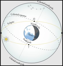 The ecliptic plane is the plane of the Earth’s orbit around the Sun. Most planets and smaller bodies have orbits lying close to this plane, so it is convenient to use it as the reference plane. This system is used for representing the positions and orbits of objects in the Solar System. The origin may be the taken either at the centre of Earth or of the Sun. The primary direction is towards the “first point of Aries”, corresponding to the vernal equinox.