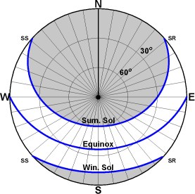 N. The three curves are for the Summer solstice, the Equinoxes and the Winter solstice. The white area in the figure illustrates the region of the celestial dome where the Sun may be seen. It also gives the maximum (noonday) elevation and the azimuth at sunrise and sunset, when the elevation is zero.