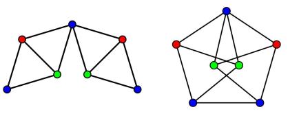 It is trivial to show that . Just consider any equilateral triangle in the plane with unit length sides. We can eaaily do better than this. A clever graph known as the Moser Spindle, was discovered by Leo Moser. Consider two rhombi, each made of two equilateral triangles, sharing a common vertex (Figure above, left panel). Now, keeping them rigid, rotate the rhombi about the top point until the lowest points are a unit distance apart, and add an edge between these points. (Figure above, right panel). Then it is clear that these two points must be assigned different colours. But that implies that four colours are required.