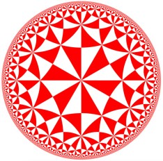 triangular hyperbolic tiling that inspired the artist M. C. Escher to create some of his remarkable images. All the triangles are congruent (of equal shape and size) in the Poincaré metric.