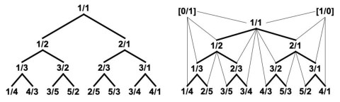 The Calkin-Wilf Tree has the structure of a pure binary tree. The Stern-Brocot tree (right panel) differs from this: each number has two “parents” and is formed as the mediant: the parents and