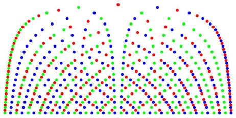 The pattern of parities in the Farey Tree are seen by colouring the three types as follows: Even Blue; Odd
