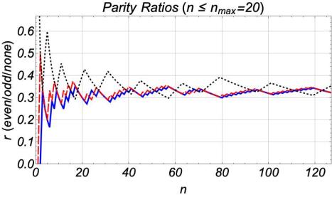 It appears that the three parity types occur with about the same frequency. Indeed, counting the proportions for increading values of the denominators, we find that they all tend to the limit . This is shown in the Figure below: