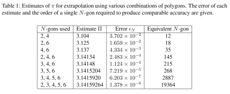 which is correct to three figures. This is a dramatic improvement on the two estimates from which it is constructed. As Richardson noted, a single inscribed -gon would require 35 sides to produce such accuracy.