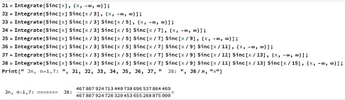 , but that the eighth should deviate ever-so-slightly from this value. However, the analysis of Borwein and Borwein (2001) made it clear that the numerical results were correct. The first figure above shows some output from a Mathematica notebook, confirming the results. Schmid (2014) provides another analysis of the phenomenon, and an excellent video in the 3Blue1Brown series of Grant Sanderson gives further insight into the strange behaviour of the Borwein integrals.