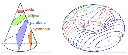 . Spiric sections are the intersections of planes parallel to the axis of the torus. The position on a torus may be specified by toroidal and poloidal coordinates. The toroidal component (