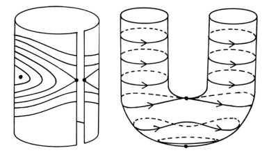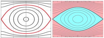 (left panel). In the right panel we show the phase portrait for a simple pendulum. The similarity between the two plots is clear. For the pendulum, each curve represents a specific energy level. As energy is conserved, the trajectories in phase space lie on constant energy surfaces.