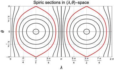 It is enlightening to plot the spirics as functions of the toroidal and poloidal coordinates. We do this in the following figure. The image is symmetric about the vertical through . The two curves corresponding to the lemniscates are plotted in red.