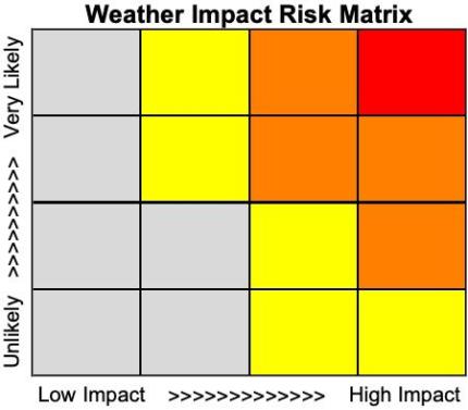 The basis for issuing impact-based warnings can be explained using a schematic diagram known as a risk matrix. The horizontal axis of the risk matrix represents the impact; the vertical axis indicates the probability of the event. Moving horizontally to the right, the impact varies from very low to extremely high; moving vertically, the likelihood of the predicted event increases from unlikely to very probable. The expected damage level is the product of probability and impact. For example, a likely event of medium severity and a possible event of high severity may have a similar values of expected damage or economic loss; both might be covered by an orange warning.