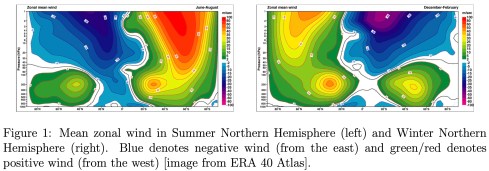 The winds in the stratosphere are easterly in summer and westerly in winter (see Figure). This has a strong influence on the propagation of energy upward from the troposphere (lowest 12 km) to the stratosphere. The circulation in the winter stratosphere comprises large planetary-scale waves superimposed on a westerly zonal flow known as the polar-night jet. The figures below show the pressure and wind fields at 250 hPa (around 10km high). The waves have quasi-stationary components but also components that propagate towards the west.