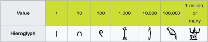 The number system of Ancient Egypt was decimal-based, with a new system being introduced for each power of 10. Units were written as strokes, tens as horseshoes, hundreds as ropes, thousands as lilies, and so on. and so on. Thus, were written as