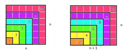 Sometimes there is a simple geometric illustration of the result. To get the sum of the first odd numbers, we can arrange them in a square pattern (see Figure, left panel).