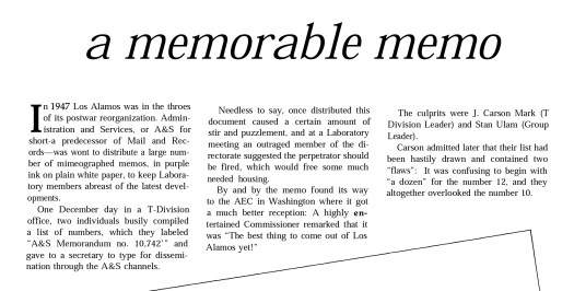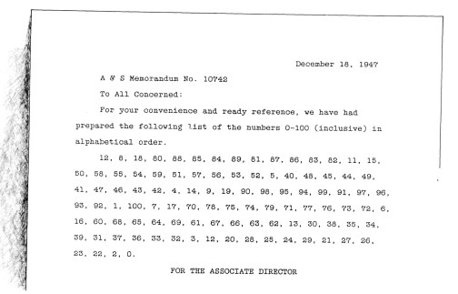 Anyone who has worked in a large organization, with an over-loaded Administration Division, will sympathise with the actions of two scientists at the Los Alamos National Laboratory (LANL) in issuing a spoof Memorandum. They had become frustrated with the large number of mimeographed notes circulated by Administration and Services, or A&S, “to keep laboratory members abreast of the latest developments”. So, one December day in 1947, they drew up a table of the numbers from 1 to 100, listed in alphabetical order, labelled it A&S Memorandum No. 10742 and circulated it.