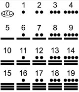 The Mayan civilization flourished in Central America between the third and tenth centuries AD. Although isolated from other centres of mathematical activity, the Mayans achieved remarkable results in numeration and calendar construction. The Mayan numeration system, with 20 as base, was used mainly for calendar computations. Only three symbols were required: dots and bars, sometimes formed using pebbles and sticks, were used for 1 and 5, and a shell symbol stood for the numeral (but not the number) zero.